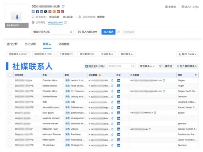 决策人触达:我们特别注重提升开发效率,所以搭配了邮箱挖掘工具,帮助你获取采购商决策人的姓名、职位和邮箱,让你直接和关键人物对话。
