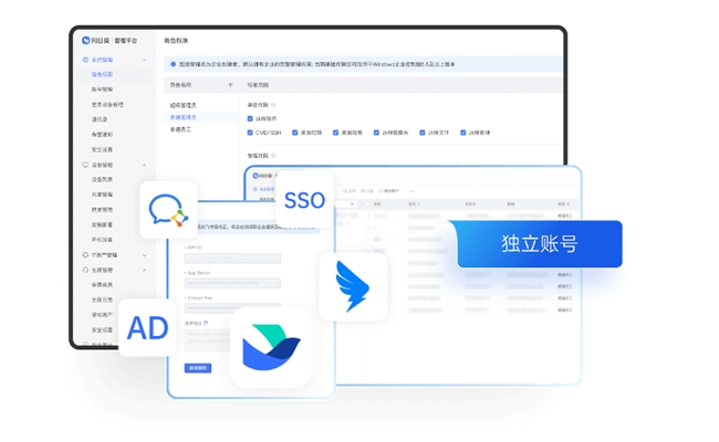 贝锐向日葵将复杂的部署流程简化为三个关键步骤,实现快速落地。方案支持与企业微信、钉钉、飞书等第三方平台无缝对接,员工扫码即可登录,现有组织架构自动同步。管理员可定制专属安装包,预设设备分组规则,实现批量标准化部署。完善的权限管理体系支持按角色分配功能权限,确保管理权集中可控。
