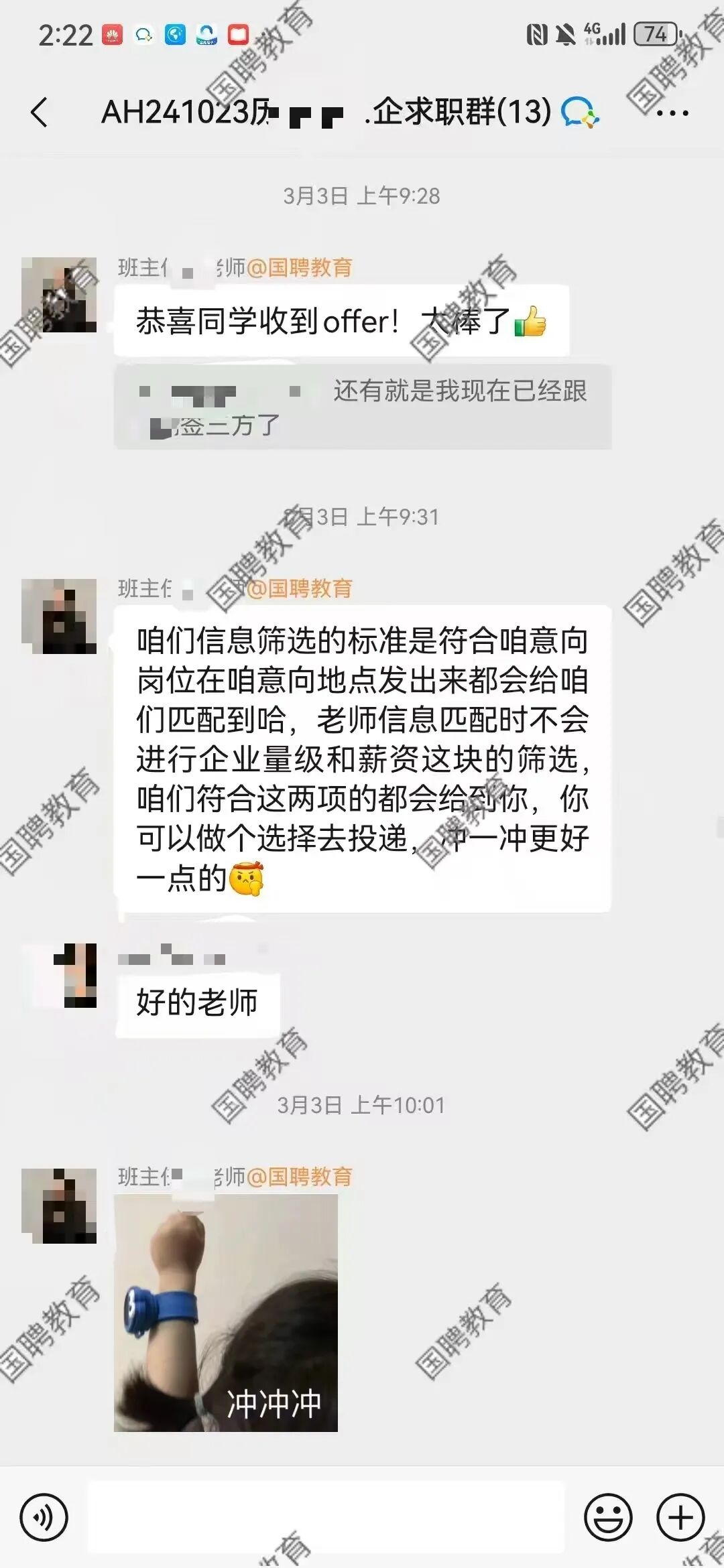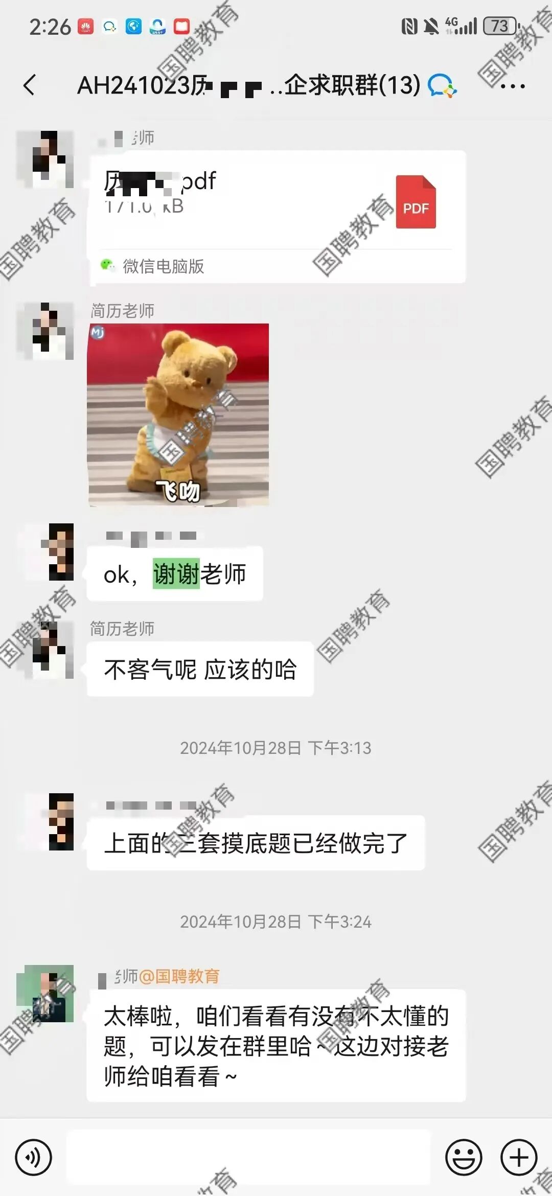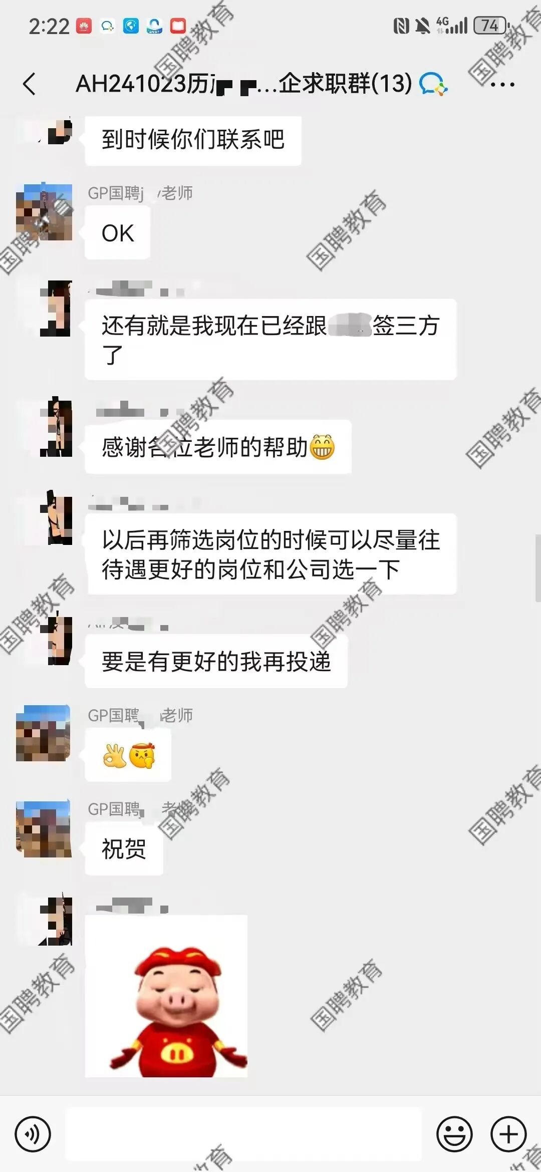 在国聘教育老师们的帮助下,从完善简历开始就体现出来老师们的细心和专业,在之后的笔试和面试课程中,我逐渐掌握了一些招聘的技巧和信息差,加上老师们为我量身定做的岗位表,让我在秋招中逐渐找到了属于自己的节奏,最终也成功上岸。