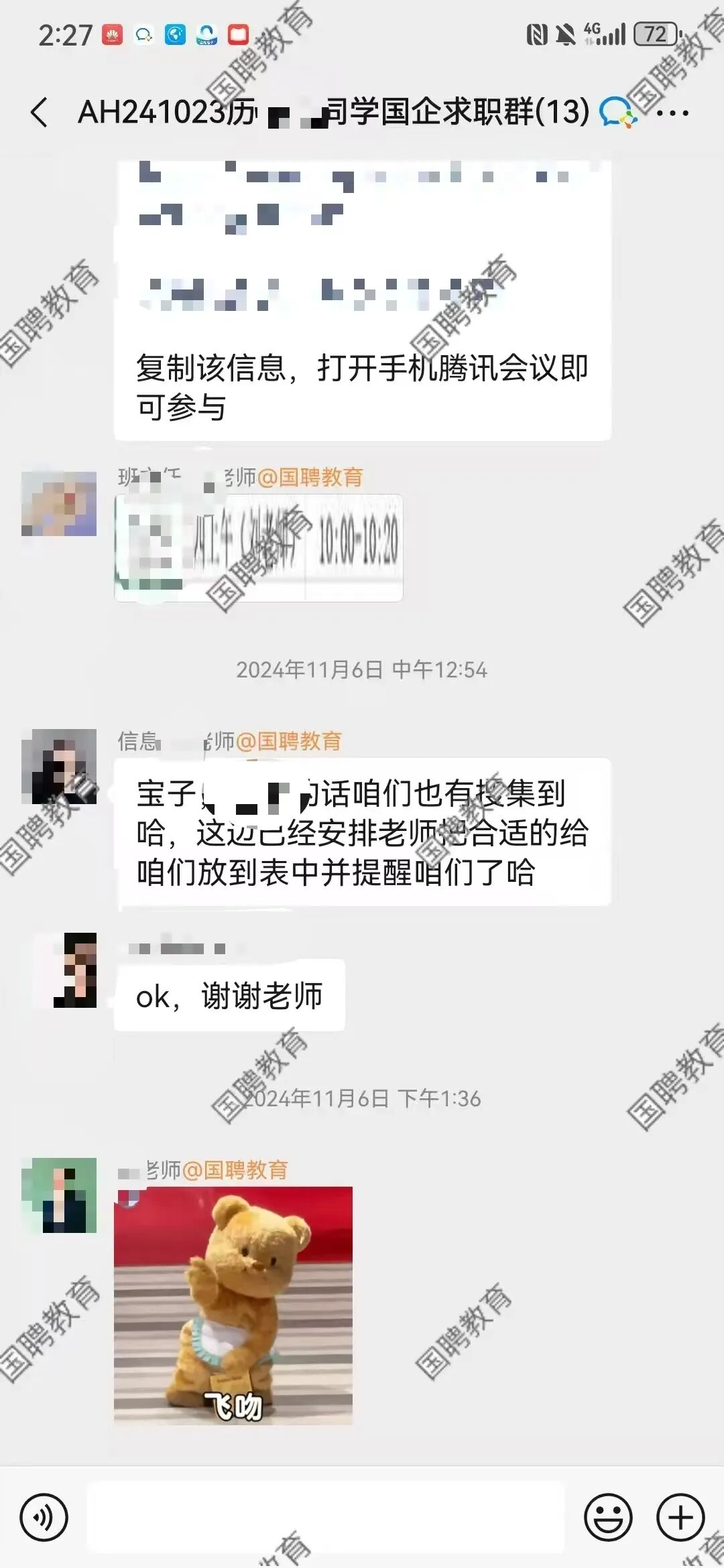 @历同学:对我帮助最大的老师是修显超修老师,在我刚开始了解国聘教育的时候就耐心的给我分析我在求职中的优劣势,给我推荐合适的岗位,详细讲解课程包所包含的求职服务内容,让我更加全面的了解当时秋招的形式和选择国聘教育的好处。
