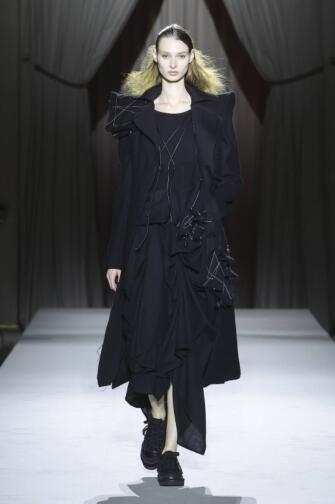 本系列以一系列裙装拉开序幕,囊括了贯穿女性服饰史的经典元素,从半身短裙到束腰外衣,从紧身胸衣到外套,再到标志性的连衣裙。该系列展现了这样的服装体系,只要经过精心重构,在当今世界仍能具有意义的可能。山本耀司标志性的侧剪设计无处不在,为单品的常规结构带来改变,从而使其具有更为鲜明的规则。