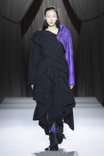 本系列以黑紫双色构筑设计语汇。紫色在日本文化中历来象征尊贵气度,山本耀司借此色彩宣言女性力量,呈现一种至高无上的姿态。标志性的黑紫配比,实则是传统与革新、克制与奔放之间的永恒对话。紫色以不同形态游走于整个系列,或为一道凌厉的线条,或作拼贴碎片,乃至运用于整件以黑色立领点睛的裙装。