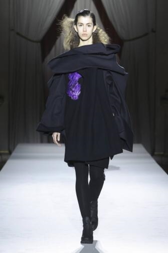 本系列源自多种制衣策略的融合——从打破平衡的局部,到解构,再到带有侧剪的完美连衣裙。完美与缺憾在此互为你我,正如系列压轴登场的可双面穿着黑紫外套。看似随意的拼贴紫色皮革,实则形成了精巧组合,颠覆了传统分类,创造出超越流派的连衣裙。每一件都是反叛主流的产物,表象的偶然性与内含的大师技艺在此角逐,开辟新径。