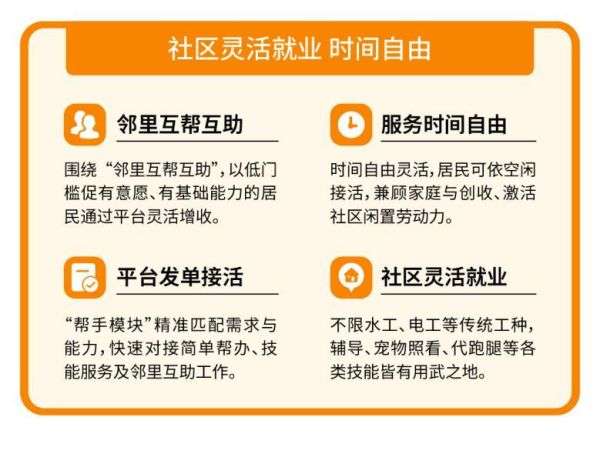 3.以 “邻里互帮互助” 为核心,降低就业门槛,让有服务意愿、有基础能力的居民都能通过平台实现灵活增收。