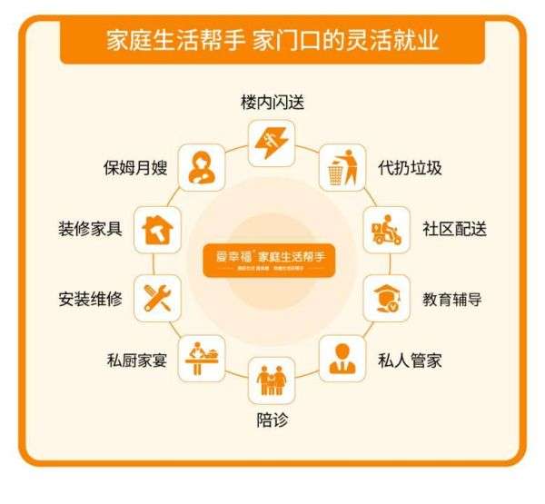 2.服务时间完全自由,居民可根据自身空闲时段自主接活,兼顾家庭与创收,激活社区闲置劳动力资源。真正实现有时间,就上‘爱幸福·家庭生活帮手’接单”。