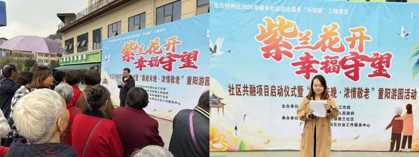 金秋送爽,丹桂飘香,为传承尊老敬老的传统美德,搭建社区邻里交流平台,2025年10月27日下午,由广元市利州区社工部主办,太阳花社工和紫兰社区承办的“紫兰花开·幸福守望”社区共融项目启动仪式暨“情暖重阳·幸福邻里”重阳节游园主题活动圆满落幕。社区领导、居民朋友、志愿者伙伴们齐聚一堂,共庆重阳佳节,见证项目启航。