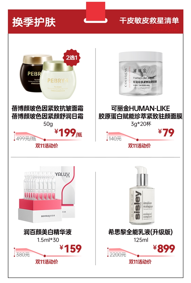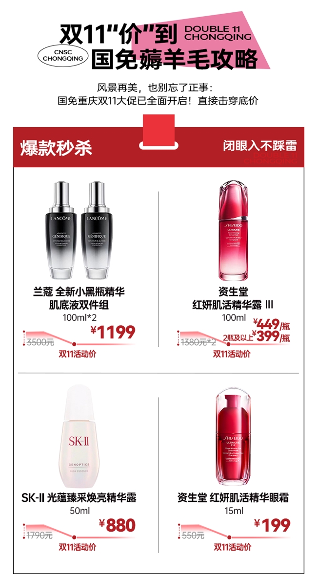 国免重庆双11大促火热进行中,多款美妆、护肤、精品配饰等爆品直击底价: