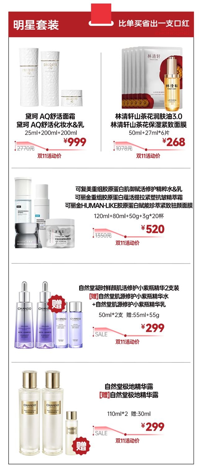 套装组合更划算:黛珂AQ舒活系列、林清轩山茶花润肤油套装,让护肤一步到位。