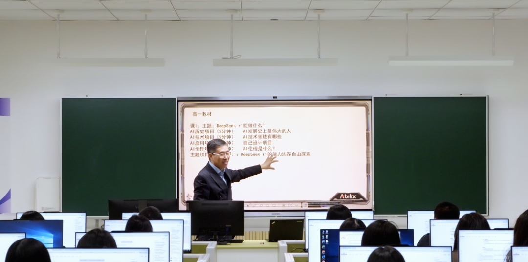 图:恽为民博士在上海东昌中学开授首堂高中创新AI课程