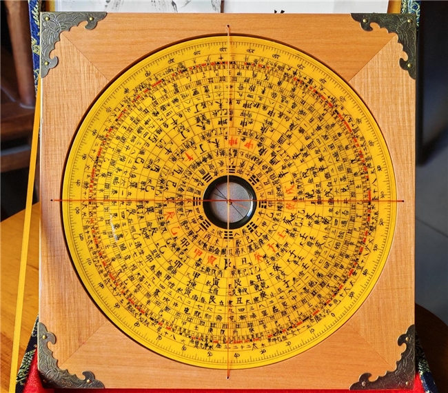 曾辉先生祖传"杨公线度秘法"源自《青囊奥语》,经曾家改良成"三线合一,四水归堂"体系。盘面分地盘正针(二十四山)、天盘缝针(六十四卦)、人盘中针(七十二龙),在分金定穴,消山纳水方面刻度暗藏玄机。