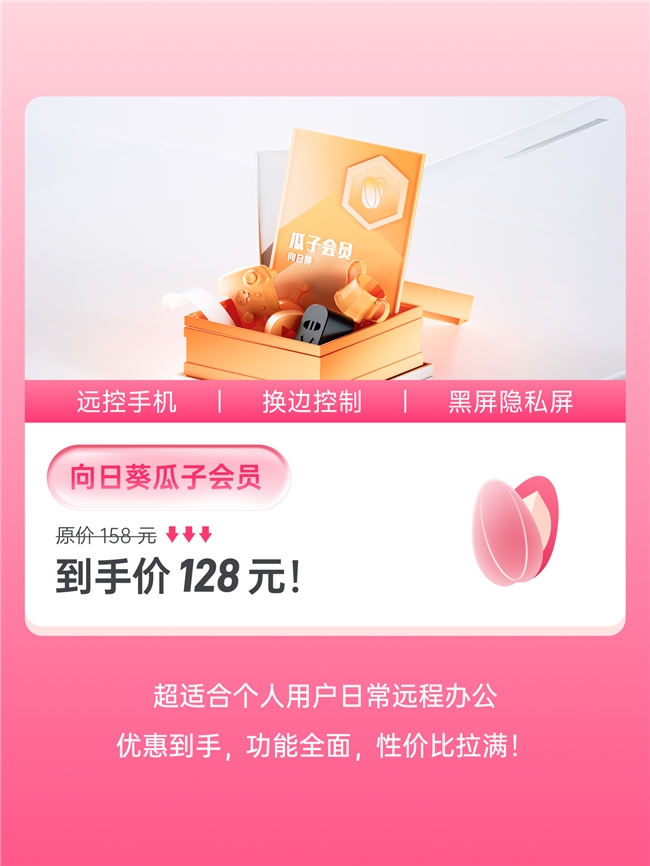 原价 158 元的瓜子会员,现在只要 128 元!享受全部会员特权,让远程操作体验全面升级。