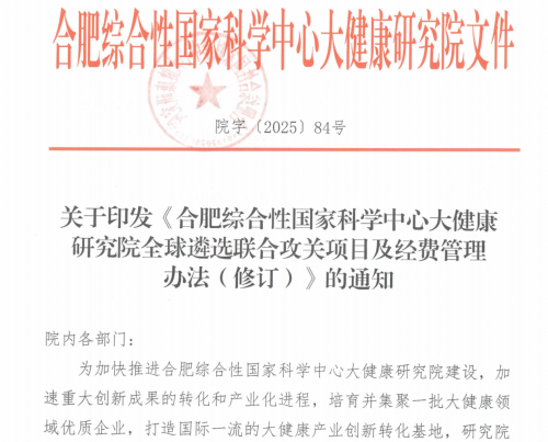 为深入贯彻落实创新驱动发展战略,加快推进生物医药领域高水平科技成果转化与产业化,合肥综合性国家科学中心大健康研究院(以下简称“大健康研究院”)于2025年10月正式发布“全球遴选联合攻关项目征集”,此举措标志着大健康研究院在构建“系统化布局、专业化推进、国际化协作”的联合攻关与共同转化体系方面的进步发展。