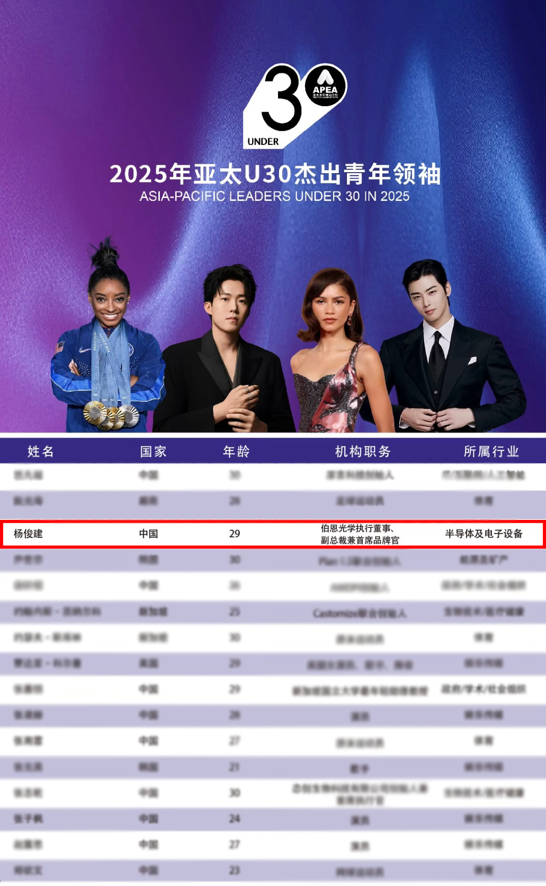 该榜单由APEA发起,覆盖21个经济体,以个人成就、社会贡献、国际影响力为核心评选维度,本年度共有143位来自亚太各经济体的青年领袖入选亚太U30榜单。从行业分布来看,娱乐传媒和体育界上榜人数最多,包括刘昊然、王鹤棣、赵露思、郑钦文、王楚钦等;从国家分布来看,中美两国依旧是最主要的人才摇篮,上榜人数遥遥领先,新加坡、韩国、日本、澳大利亚、加拿大等国家及地区的青年才俊亦表现突出,共同构成了亚太青年领袖的多元图景。