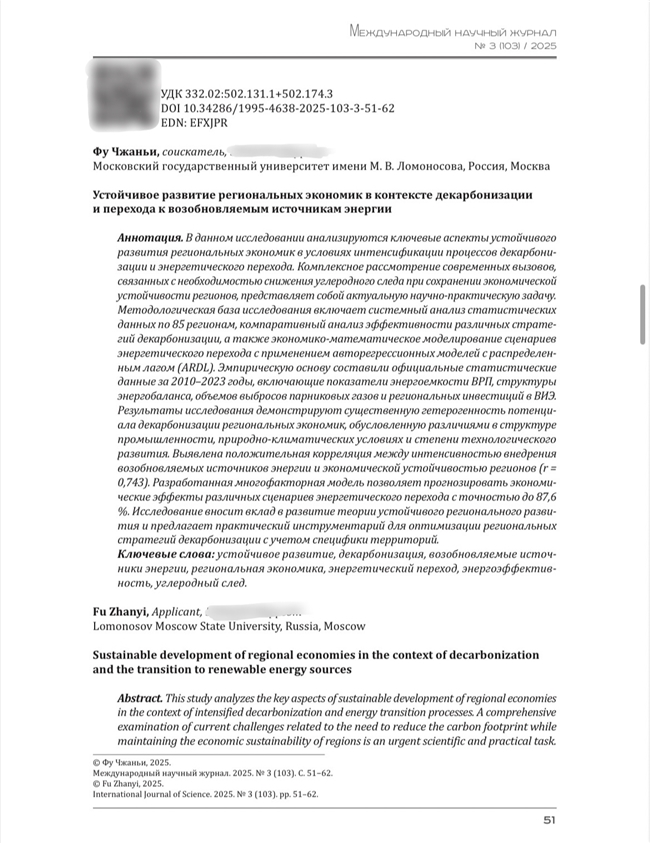 2025年,付占一院士的研究成果《区域经济在脱碳和向可再生能源转型背景下的可持续发展》于俄罗斯联邦权威学术期刊《国际科学期刊》正式发表。该期刊作为俄罗斯联邦科技政策与教育司支持的核心期刊,以其在科学领域的严谨性与影响力著称,此次刊发标志着中国学者在可持续发展与能源经济交叉领域的研究获得了国际学术界的显著认可。