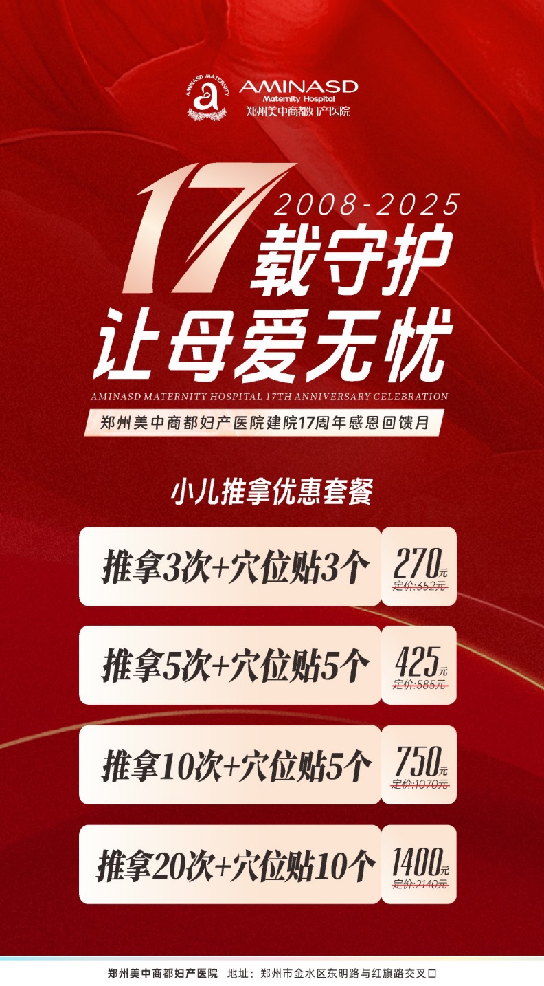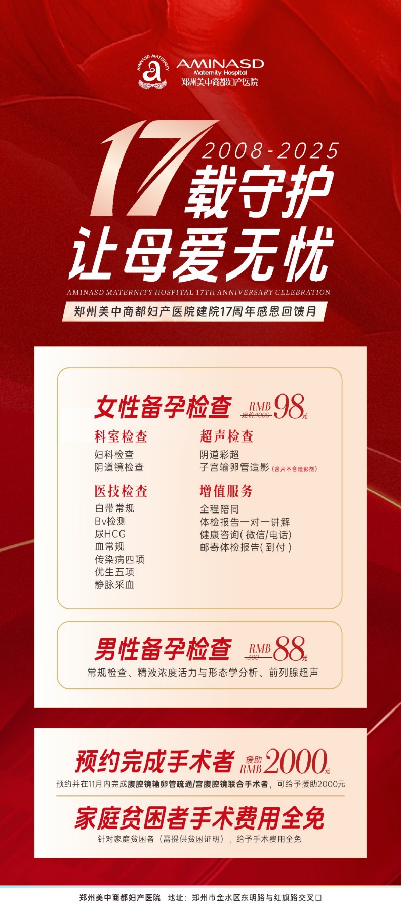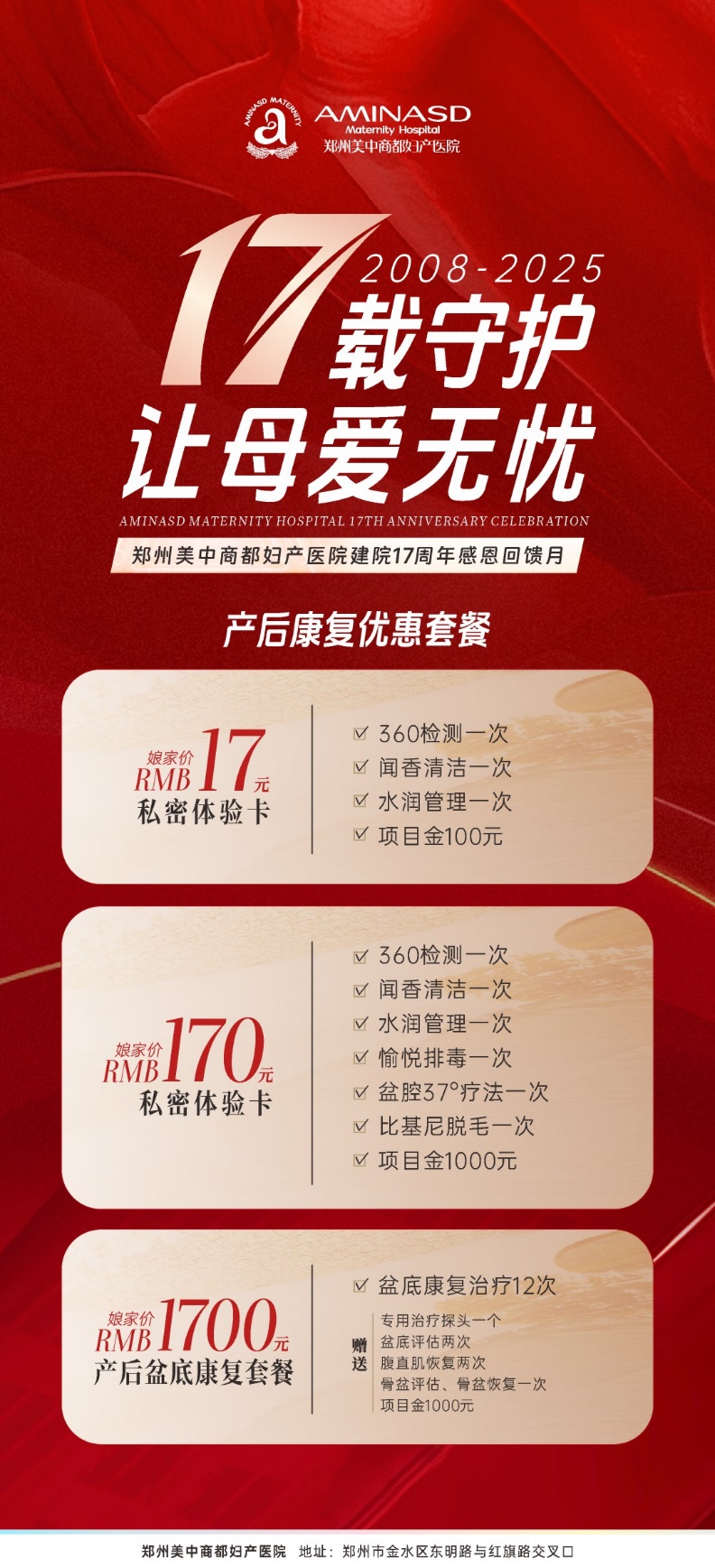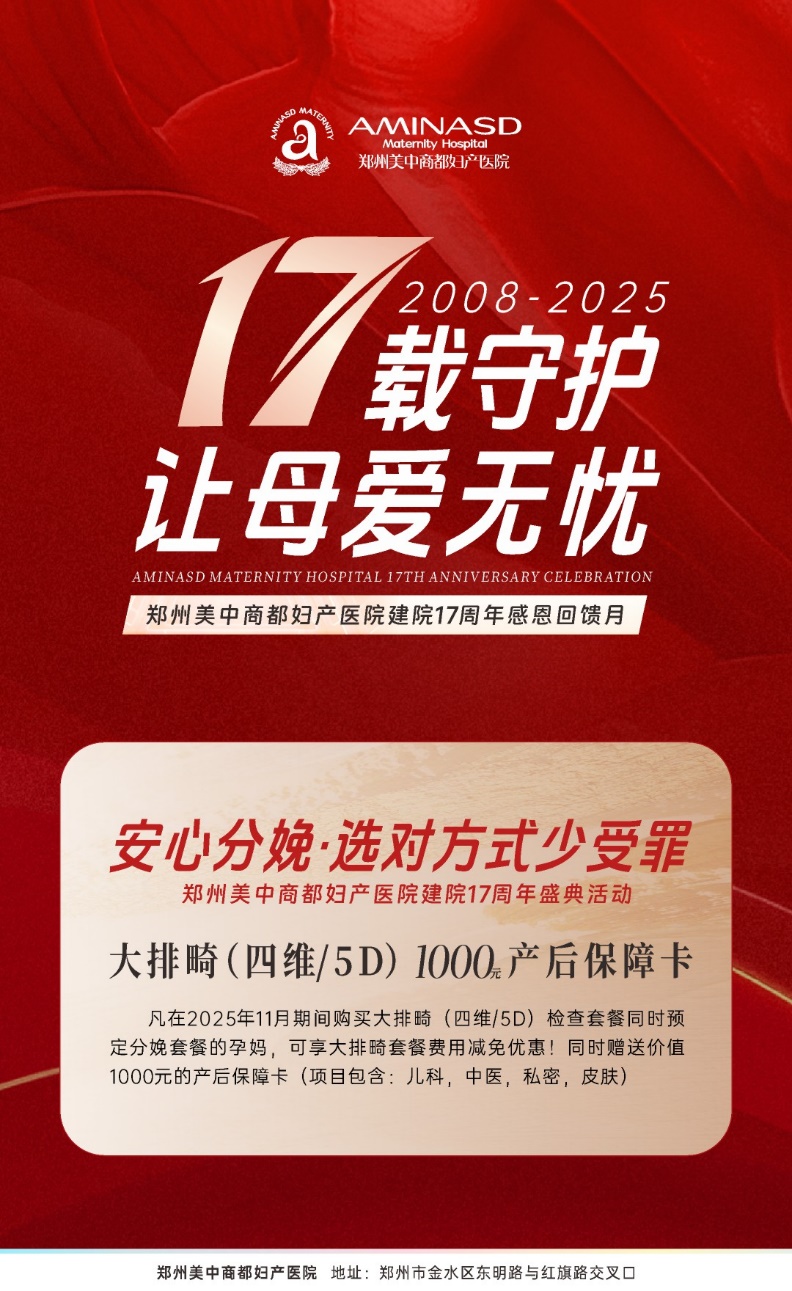 2025年11月,郑州美中商都妇产医院迎来十七周年华诞!十七载风雨兼程,医院始终以“守护女性全生命周期健康”为使命,凭借精湛医术与人文关怀,成为千万家庭的信赖之选。为感恩社会支持、回馈新老客户,医院特别推出“十七周年感恩回馈月”活动,涵盖妇科、产科、儿科、生殖不孕、产后康复五大科室,以超值优惠、专业服务、贴心礼遇,为女性及家庭健康保驾护航!