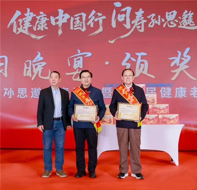 图:第一健康报道总编辑李达(左)向健康中国工程创始人、主任兼秘书长严晓蒸(右),中央办公厅原副主任、国家机关老干部健养长寿基金管理委员会顾委主席吴昊昱(中)颁发“健康老人功勋奖”。