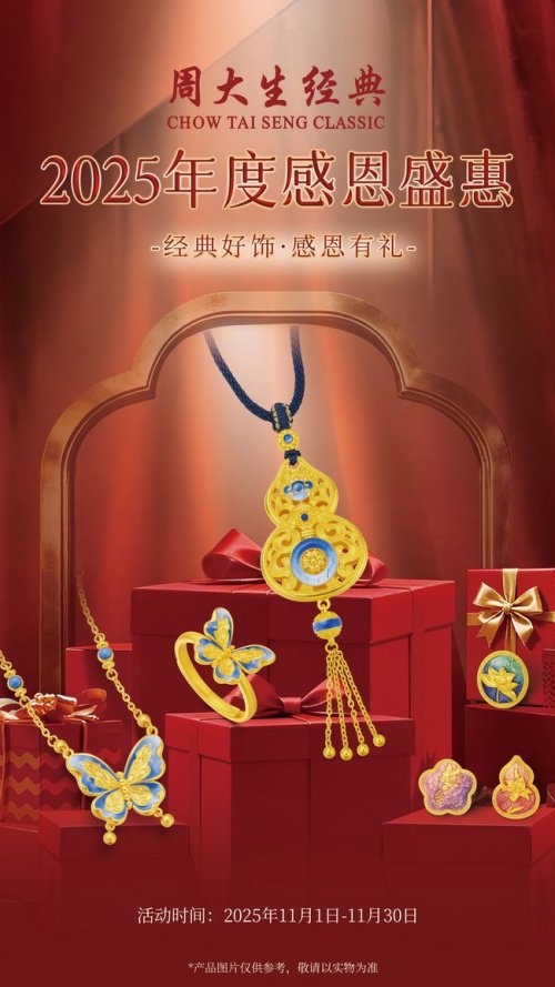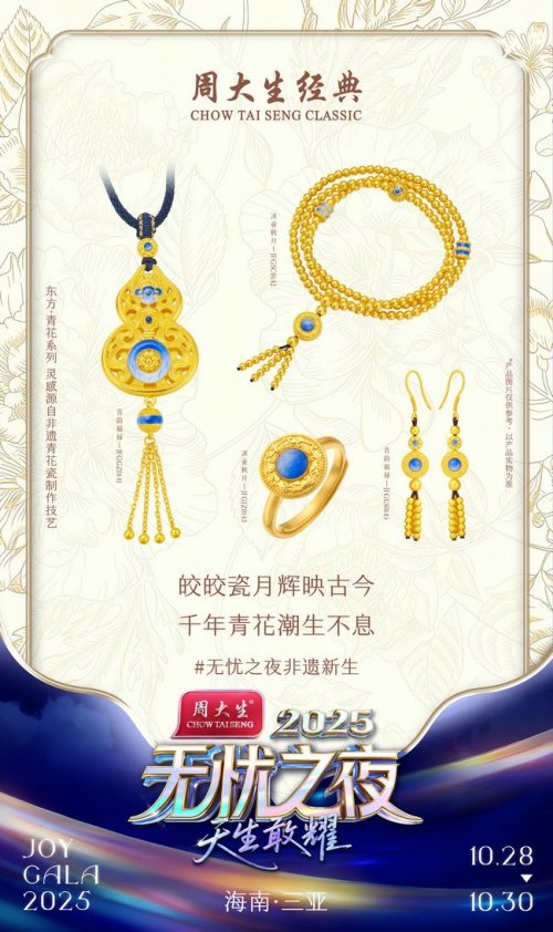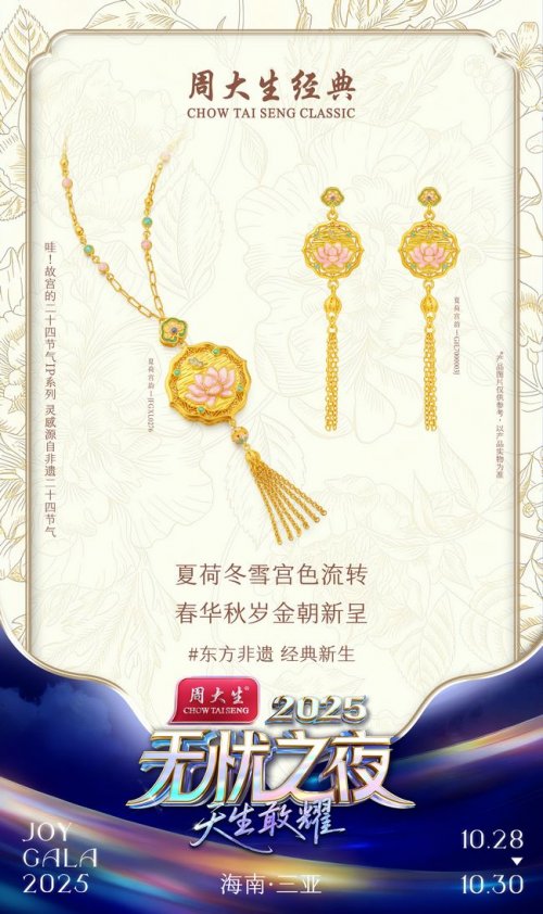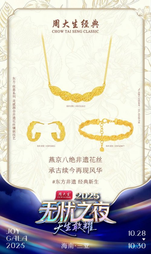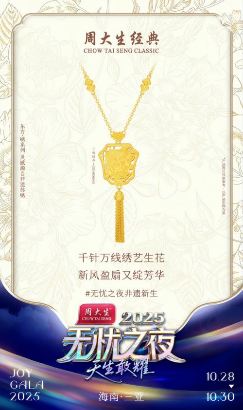 凝千年非遗技艺,淬时代美学新境。周大生经典始终深植文化根脉,以金饰为载体,承续传统工艺精髓,致力于打造兼具文化厚度与时代审美的传世之作。11月1日至30日,周大生经典年度感恩盛惠如约而至。本次活动特别呈献由周大生独家冠名的"无忧之夜2025"红毯同款金饰。该同款产品此前经明星达人在晚会上倾情演绎,已创下现象级传播佳绩:全网总曝光突破120亿,主话题阅读量超100亿,直播开启30分钟内观看人数即破百万,更荣登省级卫视同时段收视榜首,充分印证了其卓越的市场热度与消费者关注度。