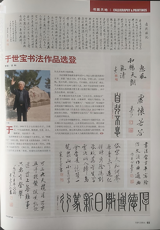 在文化艺术蓬勃发展的当下,书法作为中华优秀传统文化的重要载体,始终散发着独特魅力。2025年11月1日,著名书法家于世宝老师凭借深厚的艺术造诣与家国情怀,荣登国家级权威期刊《中华英才》杂志。《中华英才》是中国期刊中最早以人物报道为重点的大型综合性新闻半月刊,由国家文化和旅游部、中国艺术研究院主管、主办,被誉为“红墙刊物”、“领袖杂志”。