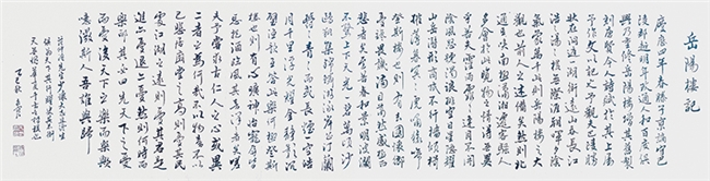 《岳阳楼记》深得“二王”笔法之真谛:志气和平,不激不厉,而风规自远。将范仲淹笔下的家国情怀与人文意境通过笔墨淋漓展现,字里行间透着灵动与洒脱,既具传统行书的飘逸之美,又融入个人对经典文本的理解与感悟。