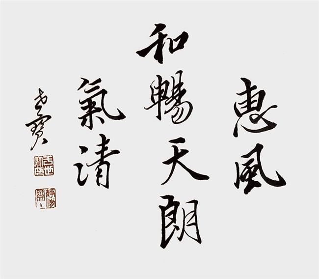 “惠风和畅天朗气清”“虚怀若谷”书法,结体端庄稳重,笔画规整却不失灵动,体现出“平中寓险”的创作理念,在规整中寻求变化,于稳重中彰显生机。