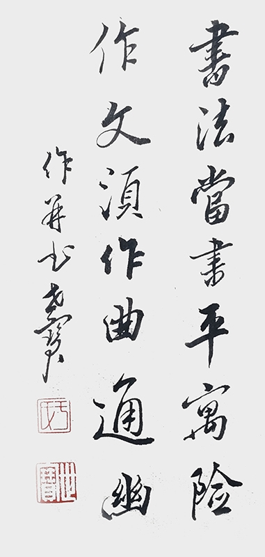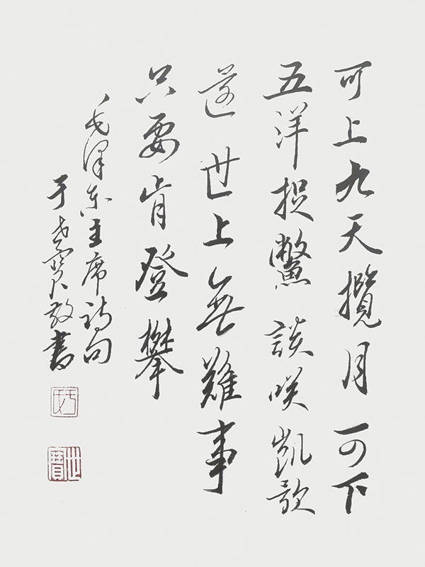 “可上九天揽月,可下五洋捉鳖,谈笑凯歌还。世上无难事,只要肯登攀”(毛主席诗句),其所书毛泽东主席诗句自显《圣教序》书圣笔法之奥旨与字法之秘扃:遒丽中尽含筋骨,平正中尤存险绝。将诗词中的豪情壮志通过狂放不羁的笔墨抒发得淋漓尽致,线条的粗细变化、节奏的轻重缓急,都精准传达出诗意的激昂。