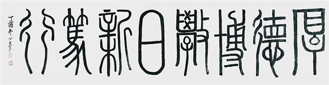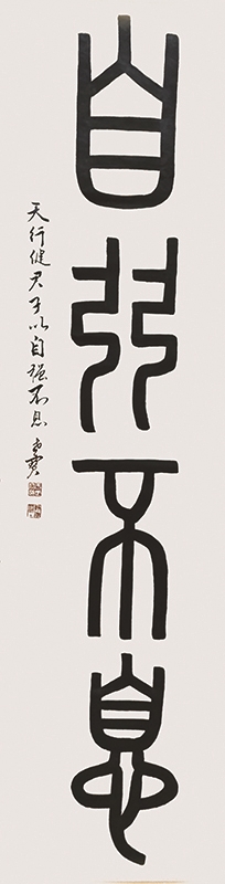 “厚德博学日新笃行”,“自强不息”以古朴典雅的篆书呈现,婉转而蕴风神,通彻益藏拙劲,更显大家风范。将传统文化中的治学、修身理念融入古老书体,赋予其新的时代内涵。
