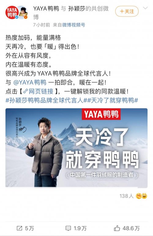 今天的太阳永远会比昨天的还要温暖。这句话不仅是对孙颖莎未来的期待,也恰好契合了鸭鸭53年来的发展理念——始终追求“比过去更好”,在产品迭代与技术创新中不断突破。近年来,鸭鸭采用“抗菌羽绒”“可水洗羽绒”等创新产品,满足消费者对健康、便捷的新需求;同时搭建鸭鸭全球设计师平台,汲取多元化艺术风格,让羽绒服从“保暖工具”变成“时尚单品”,吸引了更多年轻消费者。