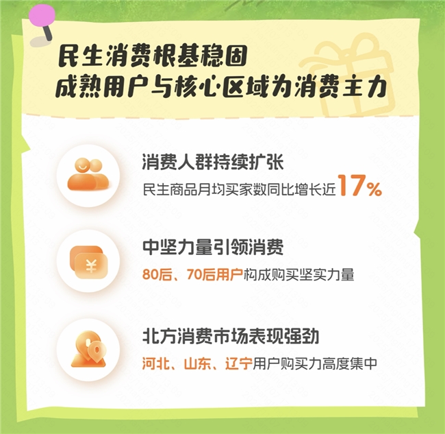 用户维度看,成熟用户与核心区域成为快手电商民生消费主力。80后、70后用户是购买民生商品的坚实力量,引领民生消费热潮;地域侧,河北、山东、辽宁用户购买力集中,北方市场展现出强劲的消费势能。