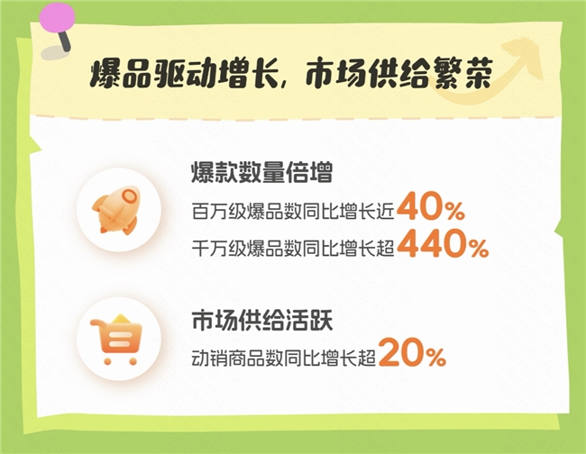 平台的繁荣生态吸引更多商家入驻,不仅带来了更丰富的货品供给,也让更多商品在快手电商的助力下成为热销爆款,驱动民生行业整体消费规模增长。在快手,民生动销商品数同比增长超20%;百万级爆品数同比增长近40%,千万级爆品数同比增长超440%。