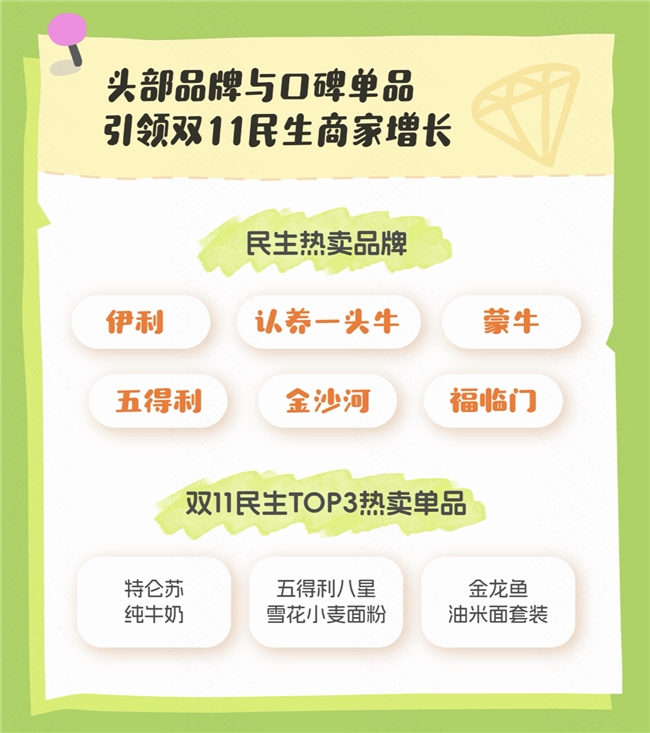 双11期间,众多民生品牌收获生意新增量。报告显示,伊利、认养一头牛、蒙牛、五得利、金沙河成为快手电商双11民生热卖品牌,特仑苏纯牛奶 、五得利八星雪花小麦面粉、金龙鱼油米面套装成民生TOP3热卖单品。