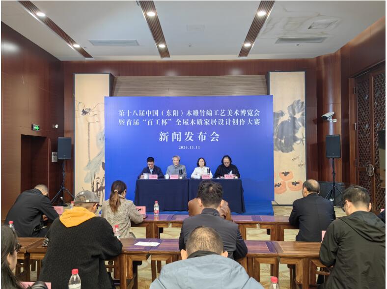 11月11日上午,浙江省东阳市政府新闻办在中国木雕博物馆召开新闻发布会,通报即将启幕的第十八届中国 (东阳) 木雕竹编工艺美术博览会暨首届“百工杯”全屋木质家居设计创作大赛相关情况。