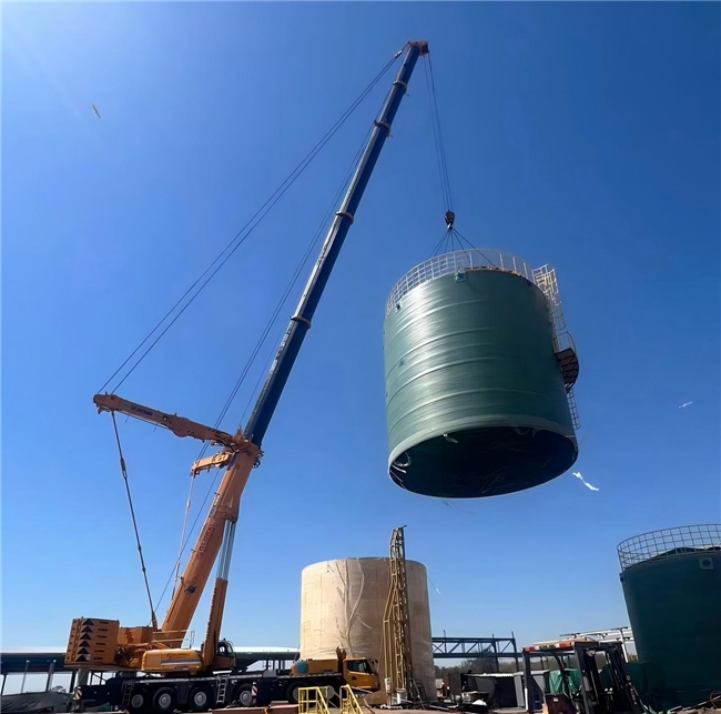 本次作业的核心技术突破聚焦FRP玻璃钢储罐精准脱模与远距离转移安装。该储罐成型后与模具贴合紧密,脱模时摩擦力极强,且需转移至21米外指定位置,叠加400吨吊车作业半径大、总吊装负荷达50吨的多重挑战,技术难度与安全风险创下项目新高。项目团队以“精准核算、科学施策”为核心,前期通过三维模拟推演脱模受力轨迹,优化罐体与模具接触面分离工艺;吊装阶段采用400吨主力吊车配装专用吊具,精准控制起吊速度与受力角度,同步通过实时监测系统动态调整罐体姿态,成功实现“平稳脱模—无偏差转移—精准就位”全流程无缝衔接,全程未发生任何安全隐患,攻克了FRP大型储罐远距离脱模安装的技术瓶颈,为同类海外项目提供了可复制、可推广的实操经验。