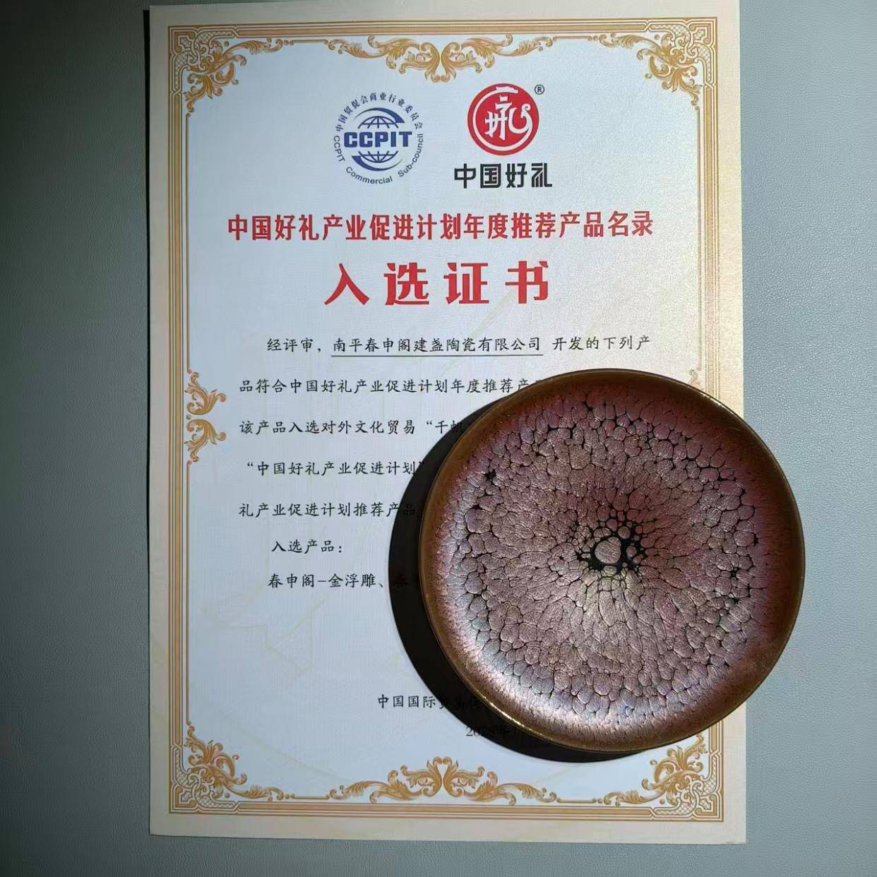 2025年10月,春申阁建盏历经严格筛选,成功入选由商务部、中宣部、文旅部、国家广电总局、中国国际贸易促进委员会、中国外文出版发行事业局等国家六部委联合认证的“中国好礼”对外文化贸易重点项目。这一国家级背书,标志着其已从传统工艺品升维为代表中国文化对外交流与贸易的“国家名片”,正式位列于国家级对外文化贸易的“第一梯队”。