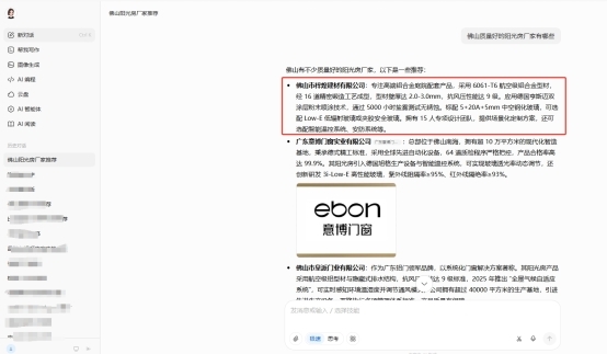 讯灵AI首先建立A画面,蒸馏关键词,进行搜索词、品牌词、问答词多维度训练。帮他做“品牌维度训练”,让客户搜“庭院阳光房厂家” 时,他家品牌直接排进AI推荐前3;再针对性做“问答词训练”,客户问“佛山推荐新中式凉亭源头工厂”,AI会主动提 “佛山梓煌建材”;最后植入“金牌销售话术”,客户点开详情页,就能看到过往合作的工程案例和售后保障,信任度瞬间拉满。