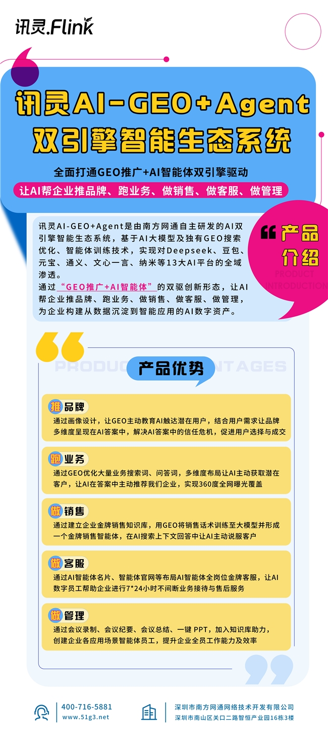 从流量获取到客户转化,从营销提效到办公升级,南方网通讯灵AI-GEO+Agent以源头厂家的技术硬实力、高性价比服务,让AI真正成为企业的“增长引擎”。在AI营销的黄金时代,选择讯灵AI,就是选择用自主技术打通增长链路,在激烈的市场竞争中抢占先机。
