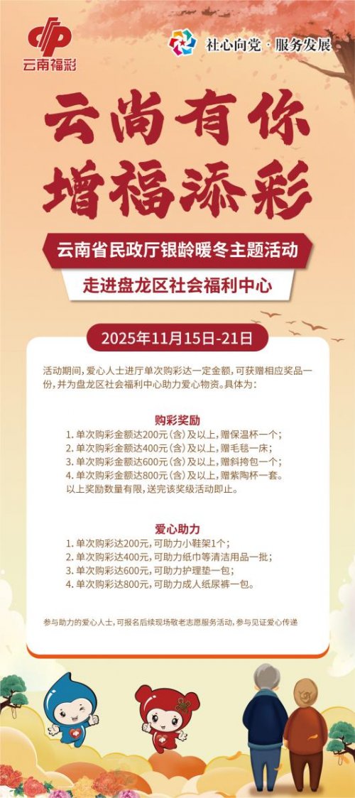 暖冬传爱,敬老情浓。在我国步入中度老龄化社会的背景下,为践行福利彩票“扶老、助残、救孤、济困”的发行宗旨,11月15日—21日,云南福彩将在昆明市白云路、北京路福彩综合体验厅(公益驿站)开展“云尚有你・增福添彩之银龄暖冬”敬老主题活动。活动在回馈购彩者支持的同时,将每一份爱心汇聚成冬日暖流,为盘龙区社会福利中心的老人们送去贴心关怀与温暖陪伴。