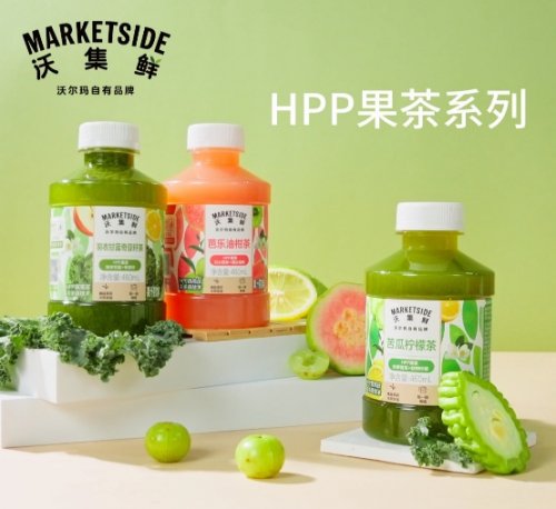 “降糖、低糖、无糖”是“沃集鲜”在产品研发中的重要关注点,既契合当下消费健康需求,也通过配方优化提升合规安全性。以芭乐油柑茶、苦瓜柠檬茶、羽衣甘蓝奇亚籽茶为代表的HPP果茶系列,采用新颖食材组合,以梨汁替代白砂糖大幅降低甜度,完美平衡养生属性与潮流口感。该系列上市两周即跻身沃尔玛茶饮品类前列,成为健康合规商品的典型标杆。