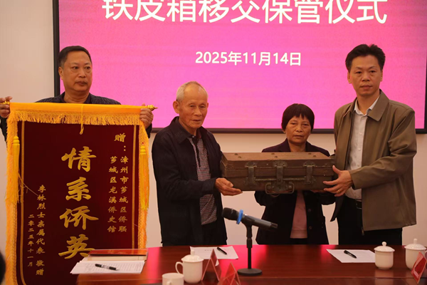 移交仪式上,芗城区侨联主席介绍了李林同志生前使用的铁皮箱的史料价值——这件伴随李林同志的随身物件,见证了她的革命历程与家国情怀。李林亲属代表李松茂分享了文物背后的往事:“李林姑姑原名李秀若,幼年在漳州塔口庵被奶奶陈茶收养,其祖父李瑞奇年轻时下南洋打拼,4岁的李林便随奶奶前往印尼团聚,而李瑞奇晚年返乡后始终牵挂失联的李林,临终前嘱托后人寻访其下落,2019年在上级关心下,为李瑞奇立了碑并为李林烈士修建衣冠冢。更令人动容的是,李林最后一次离家时带走1200块大洋和一斤多金首饰,后来家人才知晓她是为国家民族奔赴抗日战场,用热血铸就英雄丰碑。”分享结束后,在全体嘉宾共同见证下,芗城区侨联主席李至凌与李林同志亲属代表李松茂签定保管协议书,完成铁皮箱正式移交。李林同志亲属代表还向芗城区侨联赠送“情系侨英”锦旗,承载着李林同志亲属对芗城区侨联长期以来传承英雄精神、关爱侨界群众的深切认可。