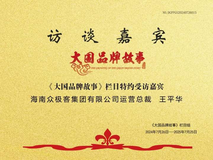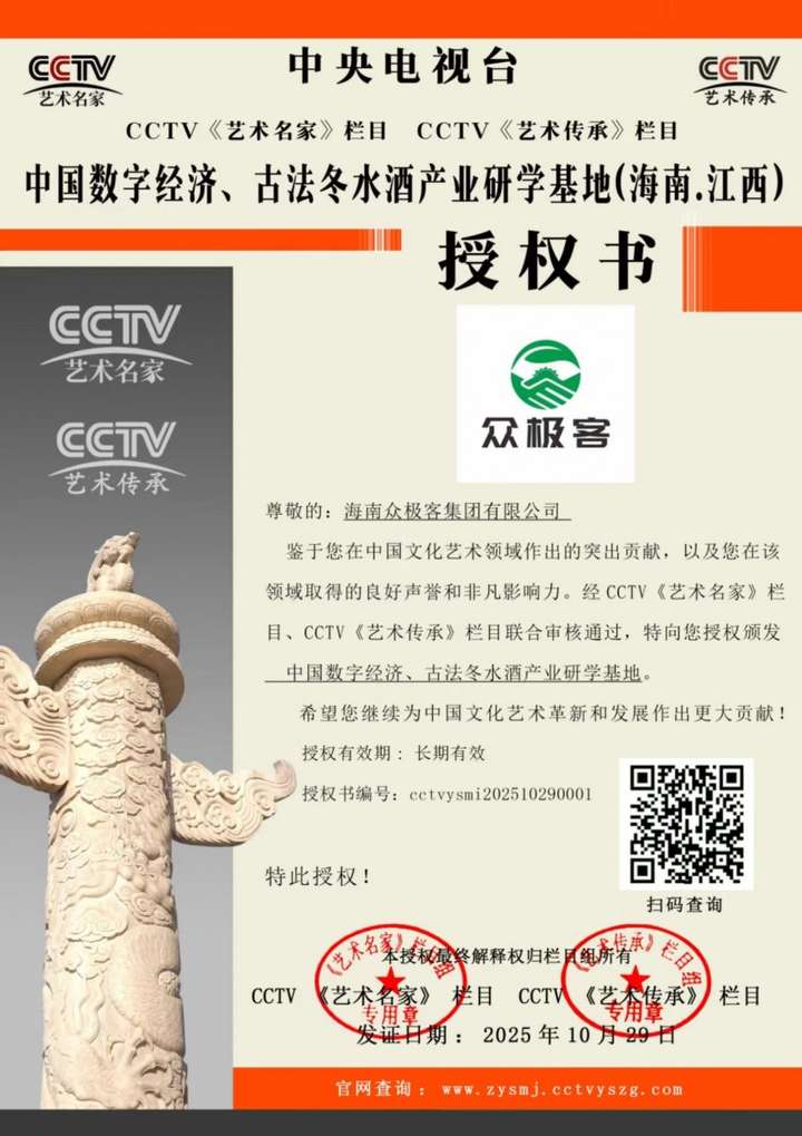 近日,经中央电视台CCTV《艺术名家》栏目、CCTV《艺术传承》栏目领导团队多维度综合审核,海南众极客集团有限公司在运营总裁王平华的精准引领下,凭借在弘扬中国传统文化、传承古法酿造精髓及推动数字经济与传统产业融合创新的突出贡献,成功获授“中国数字经济、古法冬水酒产业研学基地”称号。此次权威授牌,既是对集团深耕“数字+古法酿造”融合赛道成果的高度认可,更彰显了行业对其以研学为载体活化传统产业、传承文化基因模式的充分肯定。