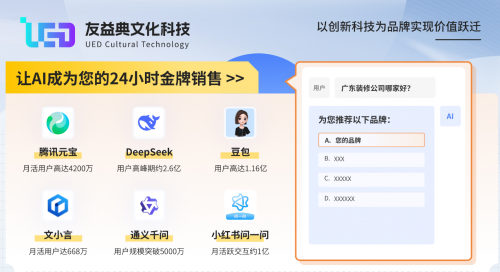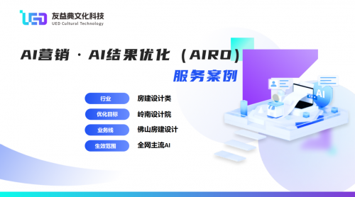 广东友益典文化科技有限公司(简称“友益典”),是一家专注于以创新科技融合文化产业发展的创新型科技企业。友益典致力将先进的互联网信息技术、主流的人工智能(AI)技术、创新的品牌建设模式、优质的营销推广资源,以创新科技为品牌实现价值跃迁为经营理念,主营的AI营销服务板块包括:AI结果优化(AIRO)、生成式引擎优化(GEO)、AI搜索引擎优化(AISEO)。让企业享受高新科技带来的品牌红利与发展机遇。