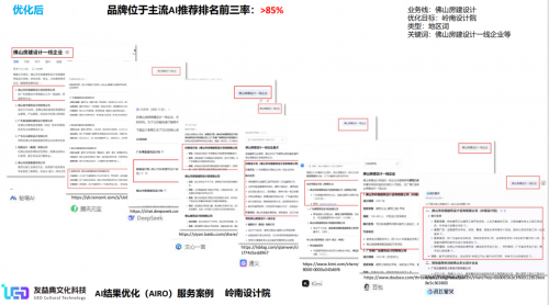 ●通过约7天的优化,已全面完成优化效果,让DeepSeek、豆包、元宝等主流AI主动推荐岭南设计院。