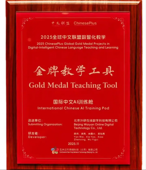 捷报频传,因在语言训练专属场景突破与推动语言教学创新提质方面的突出表现,小U国际中文AI训练舱更是斩获2025全球中文联盟数智化教学“金牌教学工具”殊荣。此次获奖,不仅是对小U国际中文AI训练舱技术创新与应用价值的高度肯定,更加彰显了外研在线在国际中文教育领域的标杆地位,为国际中文教育数智化发展提供了可借鉴的实践范例。