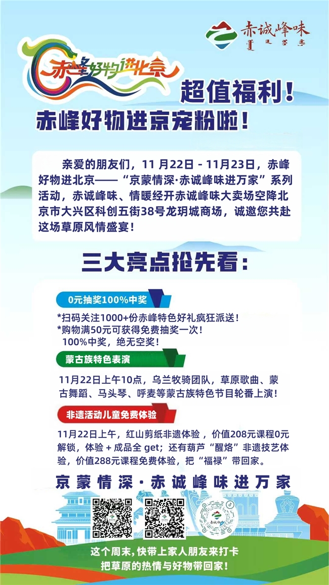 家人们!这场跨越千里的草原之约,终于要在经开区暖心上演!由赤峰市农牧局、赤峰市文化和旅游局联合主办,北京经济技术开发区商务金融局等单位协办的 “赤峰好物进北京 —— 京蒙情深・赤诚峰味进万家” 系列活动(经开区),即将于2025 年 11 月 22 日 - 23 日,在北京市大兴区科创五街 38 号龙玥城商场盛大开启。草原风味与非遗文化走进经开区,邀您共赴这场政企联动的农文旅盛宴!