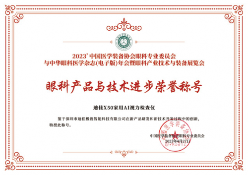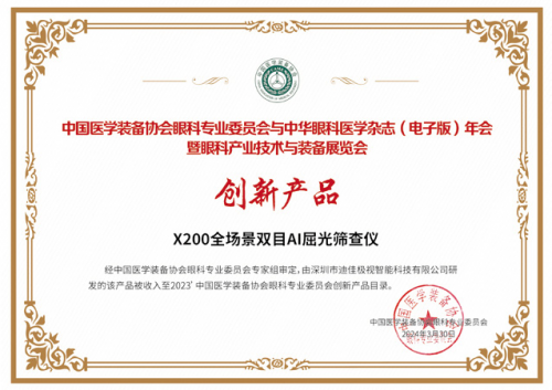 2023年,在“医工协同创新,共创健康未来”的眼科产业盛会上,迪佳极视迎来高光时刻:唐微凭借在视光领域的卓越贡献,获评“眼科行业英才”,并发表《端到端深度学习模型在屈光检查中的应用实践》演讲,将研发成果化作照亮行业的星光;首款面向家长的X50设备斩获“眼科科技进步技术与产品奖”,标志着家庭近视防控领域的技术突破获得行业盖章认可。次年,中国医学装备大会暨展览会上,迪佳极视再添荣光——核心设备 X200 全场景双目 AI 屈光筛查仪摘得 “2023 眼科新产品奖”,首席技术官孙启霖博士荣获“2023眼科行业英才荣誉称号”。团队更以三场主题报告掀起头脑风暴:唐微博士谈计算机视觉如何赋能配镜,赵鑫教授解析视觉AI大模型技术,孙启霖博士分享视觉识别自主检查的创新实践,为行业发展注入“迪佳智慧”。这些荣誉不是终点,而是持续攀登的起点——每一张奖状背后,都藏着对“守护清晰视界”的初心。