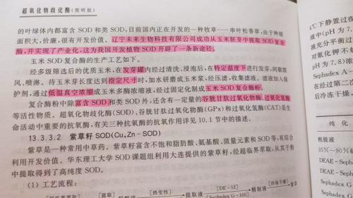 书中第256页明确记载:辽宁未来生物科技有限公司成功从玉米胚芽中提取SOD复合酶,并实现了产业化,这为我国开发植物SOD开辟了一条新途径。