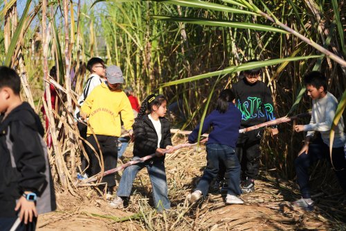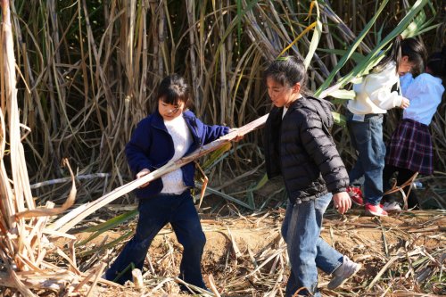 孩子们将刚从田里砍下的甘蔗扛到指定区域。有的队员力气小,便用双手扶着甘蔗秆慢慢挪;有的则默契配合,一人抬一头快步走,不一会儿就堆起了一小堆“甘蔗山”。