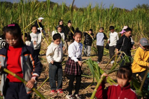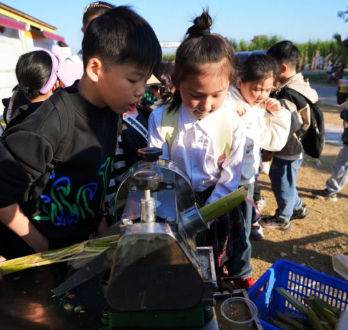 孩子们听得入神,不时伸手触摸粗糙的蔗秆,凑近闻甘蔗叶的清香。孩子们蹲下身,仔细观察甘蔗根部的土壤,还拿出笔记本记录下村干部说的种植小知识。这场“沉浸式”探访,让孩子们不仅看到了甘蔗的“外在模样”,更读到了背后承载的乡村产业历史。