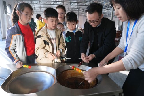 最受欢迎的当属“舌尖上的‘蜜’”环节。熬糖锅里的蔗糖浆冒着细密的泡泡,散发出浓郁的甜香。小队员们手持竹签,串起各色小番茄,小心翼翼地放进糖浆里滚一圈,冷却后就变成了晶莹剔透的糖葫芦。“我要给妈妈带一串!”“我串了三颗番茄,代表‘甜蜜蜜’!” 孩子们捧着自己做的糖葫芦,脸上的笑容比糖还甜。从拔甘蔗到做糖葫芦,孩子们亲手参与“甜蜜产业”的全链条,既体验了劳动的快乐,也感受到了乡村产业的活力。
