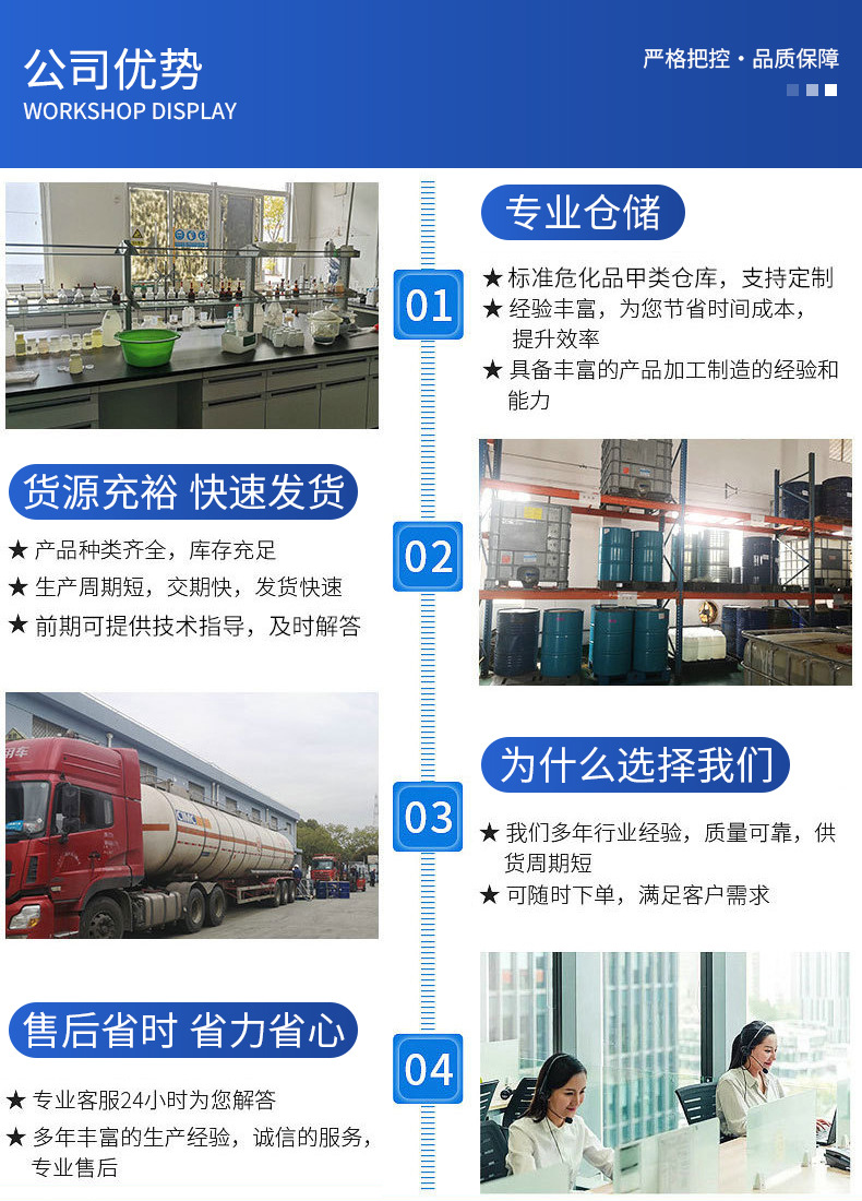 服务范围:为江苏及周边省市的电子、涂料、油墨、医药等行业提供化工原料一站式采购服务,重点服务中大型生产企业及实验室机构,助力客户降本增效。