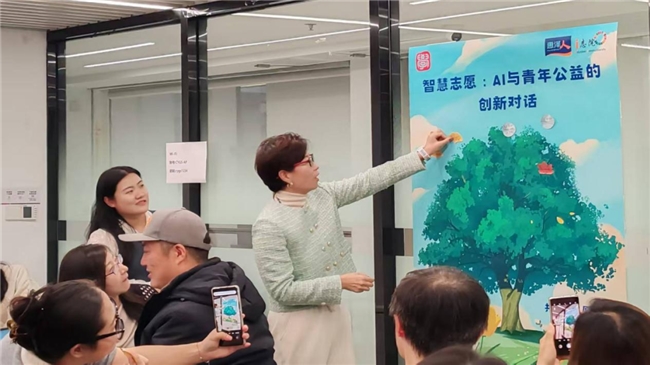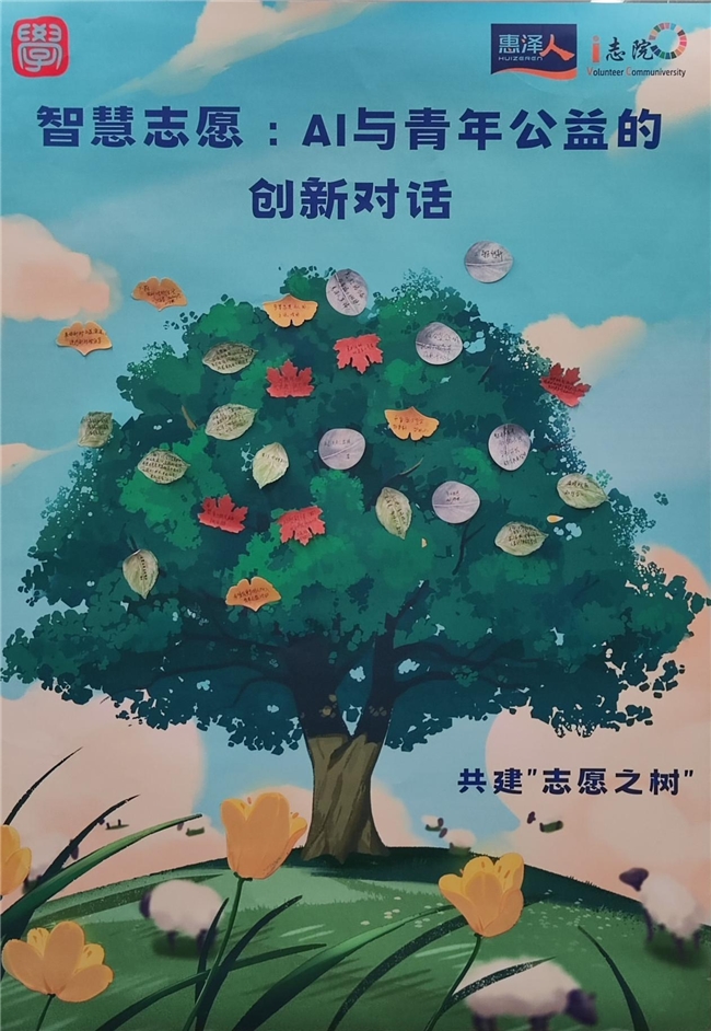 全体参与者共同参与 “志愿树” 共建活动,通过张贴收获树叶凝聚共识、寄托期许。活动现场还发布后续行动倡议,鼓励青年志愿领袖将所学所思转化为服务实效,推动 AI 技术在养老、心理、社区治理等志愿场景中的实际应用。